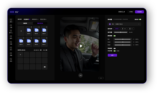 智能剪辑算法自动混剪,AI审片质智能去重,整合文案、数字人、BGM/特效,一键成片。